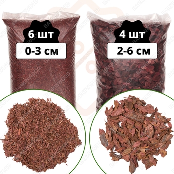 Комплект состоит из мелкой и средней фракций коры лиственницы, фракция 0-3 см обладает мульчирующими качествами быстрого действия, а средняя фракция прекрасно декорирует ваш участок.